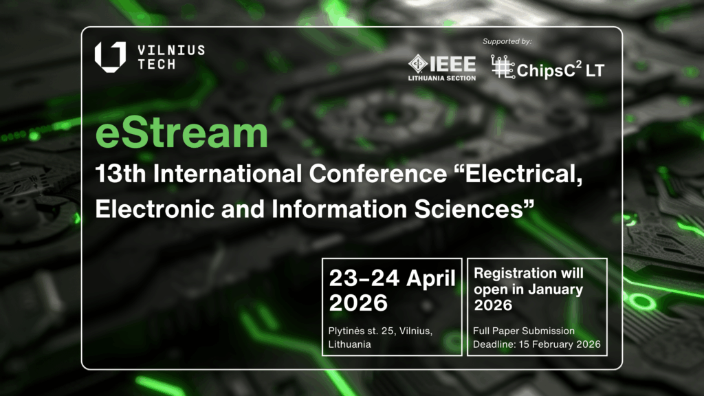 The Faculty of Electronics at Vilnius Gediminas Technical University (VILNIUS TECH) cordially invites researchers, doctoral students, members of the academic community, and industry professionals to submit papers and participate in the 13th International Conference on Electrical, Electronic and Information Sciences – eStream 2026.